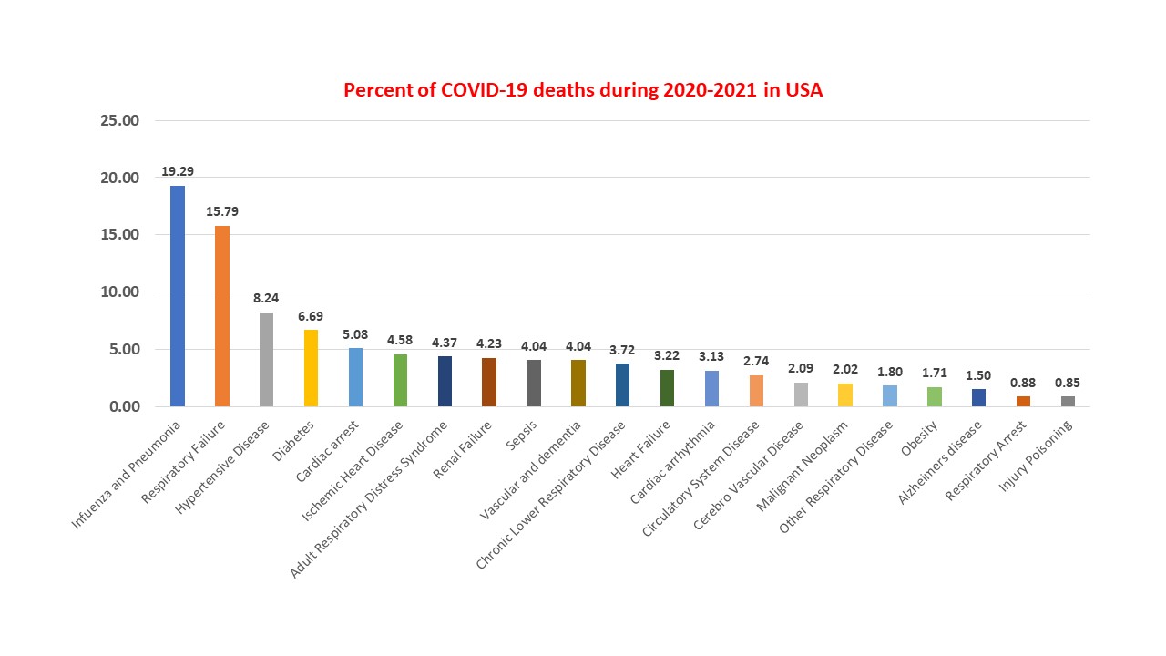 Results/Major Findings: Among the compared pre-existing health conditions, Infuenza and Pneumonia (19.29%), and Respiratory Failure (15.79%) caused the highest percent of deaths. In the other pre-existing conditions like Hypertensive Disease (8.24%), Diabetes (6.69%), Cardiac arrest (5.08%), Ischemic Heart Disease (4.58%), Adult Respiratory Distress Syndrome (4.37% ), Renal Failure, Sepsis (4.04%), Vascular and dementia (4.04%), Chronic Lower Respiratory Disease (3.72%), Heart Failure (3.22%), Cardiac arrhythmia (3.13%), Circulatory System Disease (2.74%), Cerebro Vascular Disease Malignant Neoplasm (2.09%), and Obesity (1.71%) caused Covid-19 deaths. We hypothesized that the Respiratory illness caused by Flu virus, Influenza and other Respiratory viruses deleterious immune responses against any infection caused inadequate repair mechanisms in the lung tissue. This contributed to the higher rates of deaths due to COVID-19.