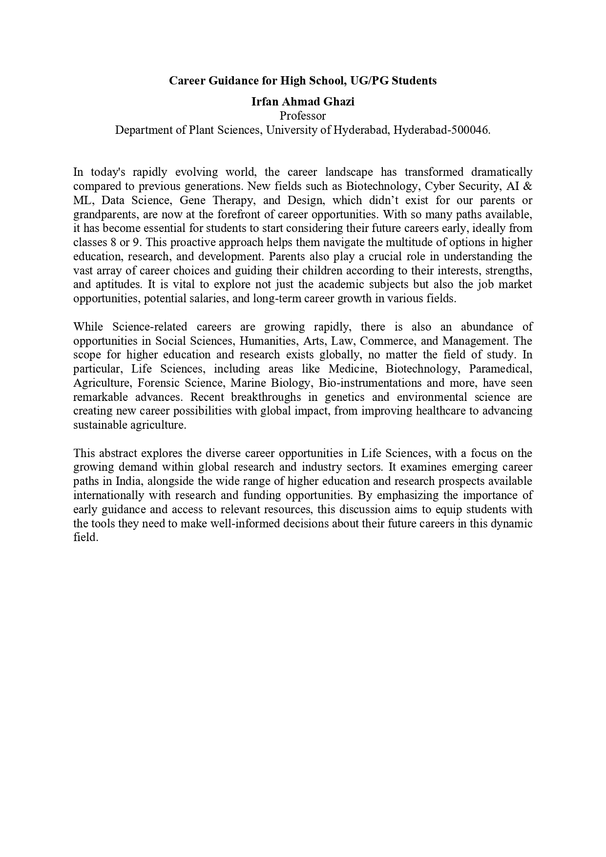 This abstract explores the diverse career opportunities in Life Sciences, with a focus on the growing demand within global research and industry sectors. It examines emerging career paths in India, alongside the wide range of higher education and research prospects available internationally with research and funding opportunities. By emphasizing the importance of early guidance and access to relevant resources, this discussion aims to equip students with the tools they need to make well-informed decisions about their future careers in this dynamic field.
