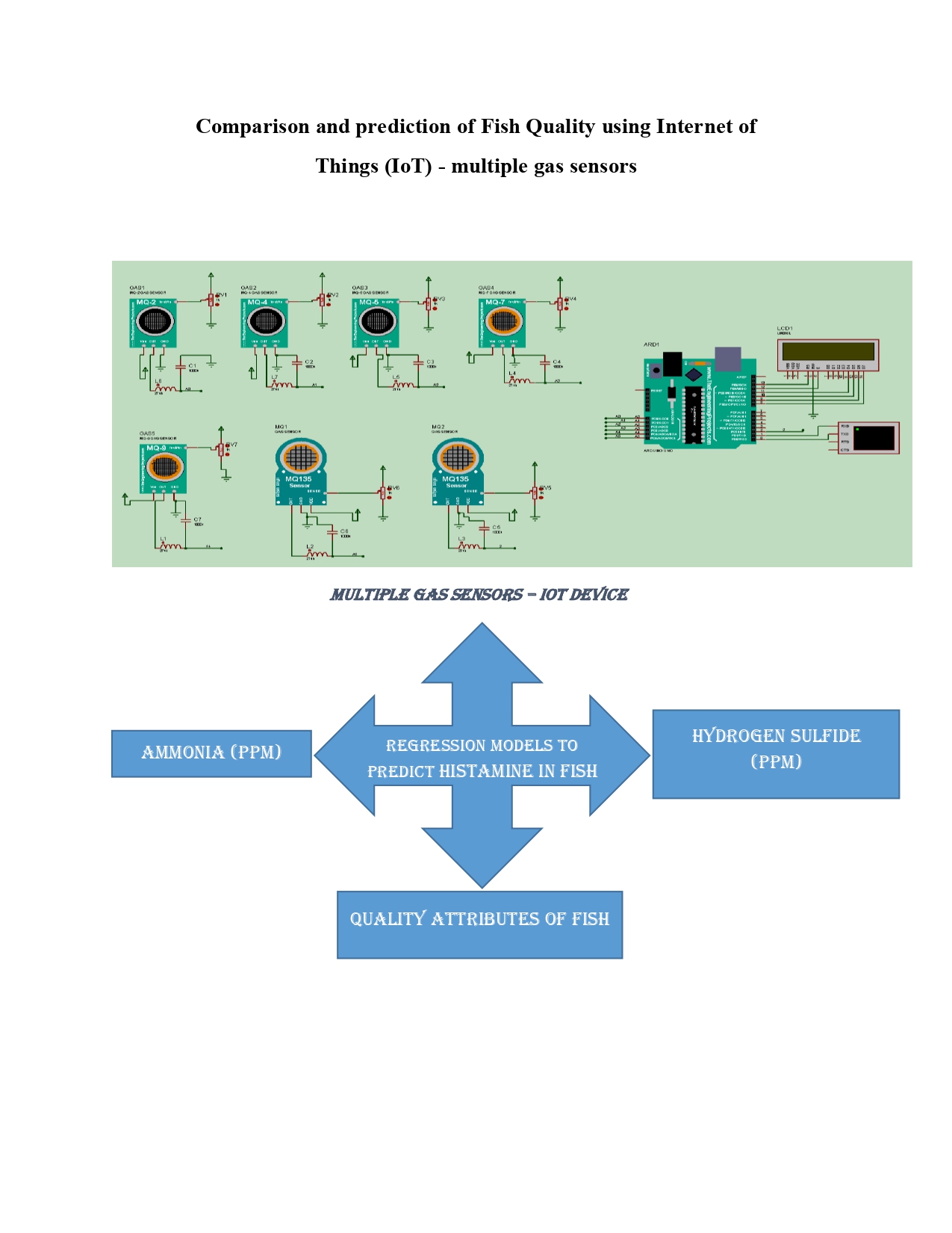 Multiple gas sensors to detect ammonia, hydrogen sulfide, carbon monoxide, methane, and butane were assembled in Arduino UNO is used as the microcontroller. Adafruit IO is the IoT to display data. PLX is used to store databases in the cloud. The MQ-135 and MQ-136 sensors measured the Ammonia and hydrogen sulfide content of packed fish. The basic quality attributes of fish fillets such as pH, protein content, fat content, Total Volatile Basic Nitrogen (TVB-N – a fish freshness indicator), color analysis, texture profile, and Fourier transform infrared (FTIR) spectroscopy analysis were performed as per standard procedures. The analysis was conducted on alternative days for 12 days in every packaging condition at refrigerated temperature for selected fish.