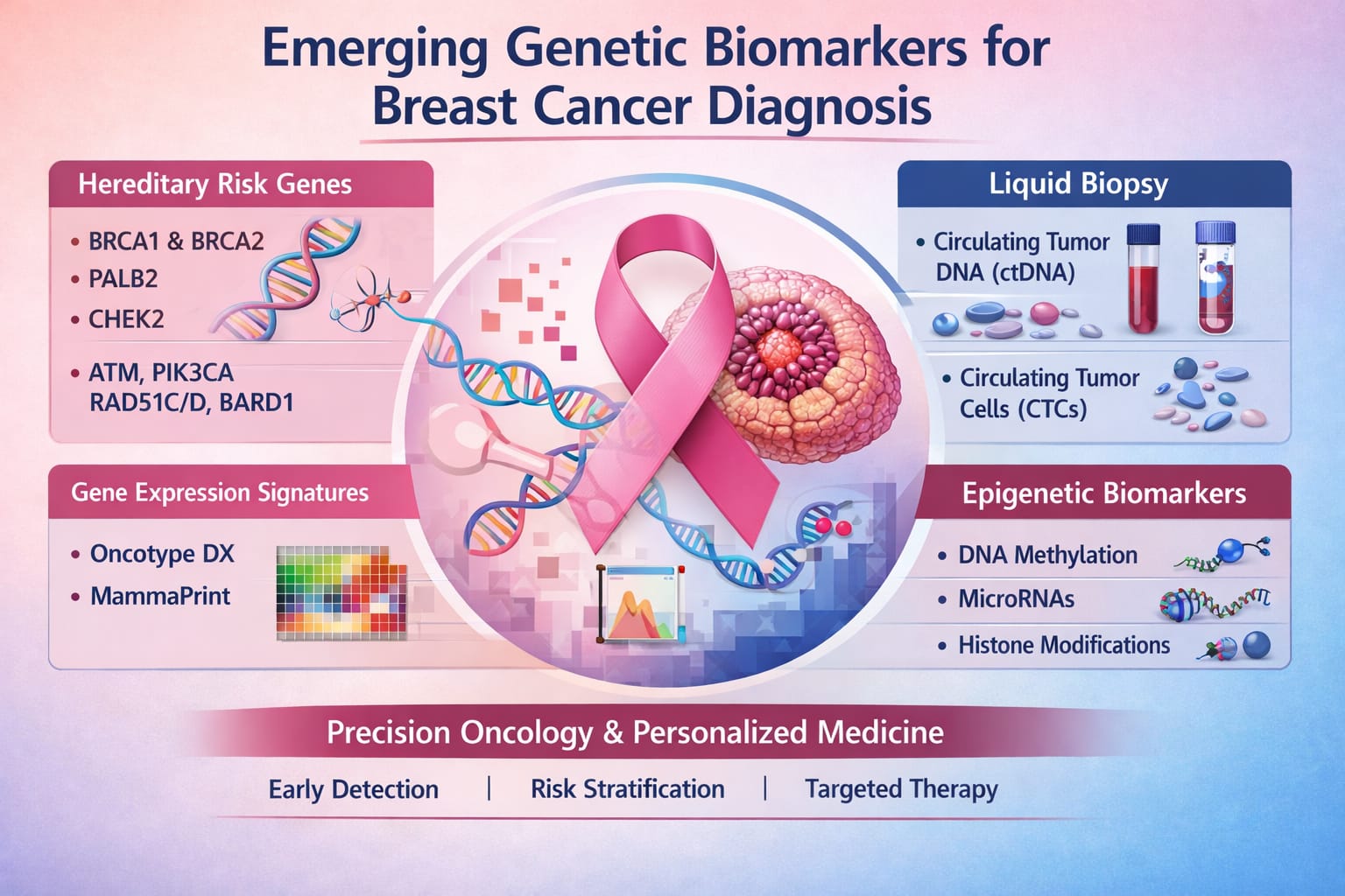 Breast cancer remains a heterogeneous malignancy in which early detection and molecular stratification are critical for improving patient outcomes. While BRCA1 and BRCA2 mutations have historically defined hereditary risk, their predictive limitations have prompted the search for broader genomic and epigenomic markers. Recent advances in next-generation sequencing, liquid biopsy technologies, and multi-gene expression profiling have expanded the biomarker landscape, enabling more precise risk assessment and therapeutic decision-making. This review synthesizes current evidence on emerging genetic biomarkers with potential clinical utility. High-penetrance genes such as PALB2, CHEK2, ATM, and PIK3CA are increasingly recognized for their role in hereditary susceptibility, while moderate-risk variants in RAD51C/D and BARD1 refine individualized risk stratification. Liquid biopsy approaches, including circulating tumor DNA (ctDNA) and circulating tumor cells (CTCs), provide non-invasive, real-time monitoring of tumor dynamics and treatment response. Gene expression signatures (e.g., Oncotype DX, MammaPrint) have demonstrated prognostic value in predicting recurrence risk and guiding adjuvant therapy. Furthermore, epigenetic markers—such as DNA methylation profiles, microRNAs, and histone modifications—are emerging as promising diagnostic and predictive tools, reflecting tumor heterogeneity and microenvironmental influences. Collectively, these advances highlight a paradigm shift toward precision oncology, where integrated genomic and epigenomic data inform personalized screening, risk stratification, and therapeutic strategies. The incorporation of novel biomarkers into clinical practice has the potential to enhance early detection, optimize treatment selection, and improve long-term survival. Continued validation in large-scale, multi-ethnic cohorts and harmonization of biomarker-driven guidelines remain essential for translating these discoveries into routine cancer care