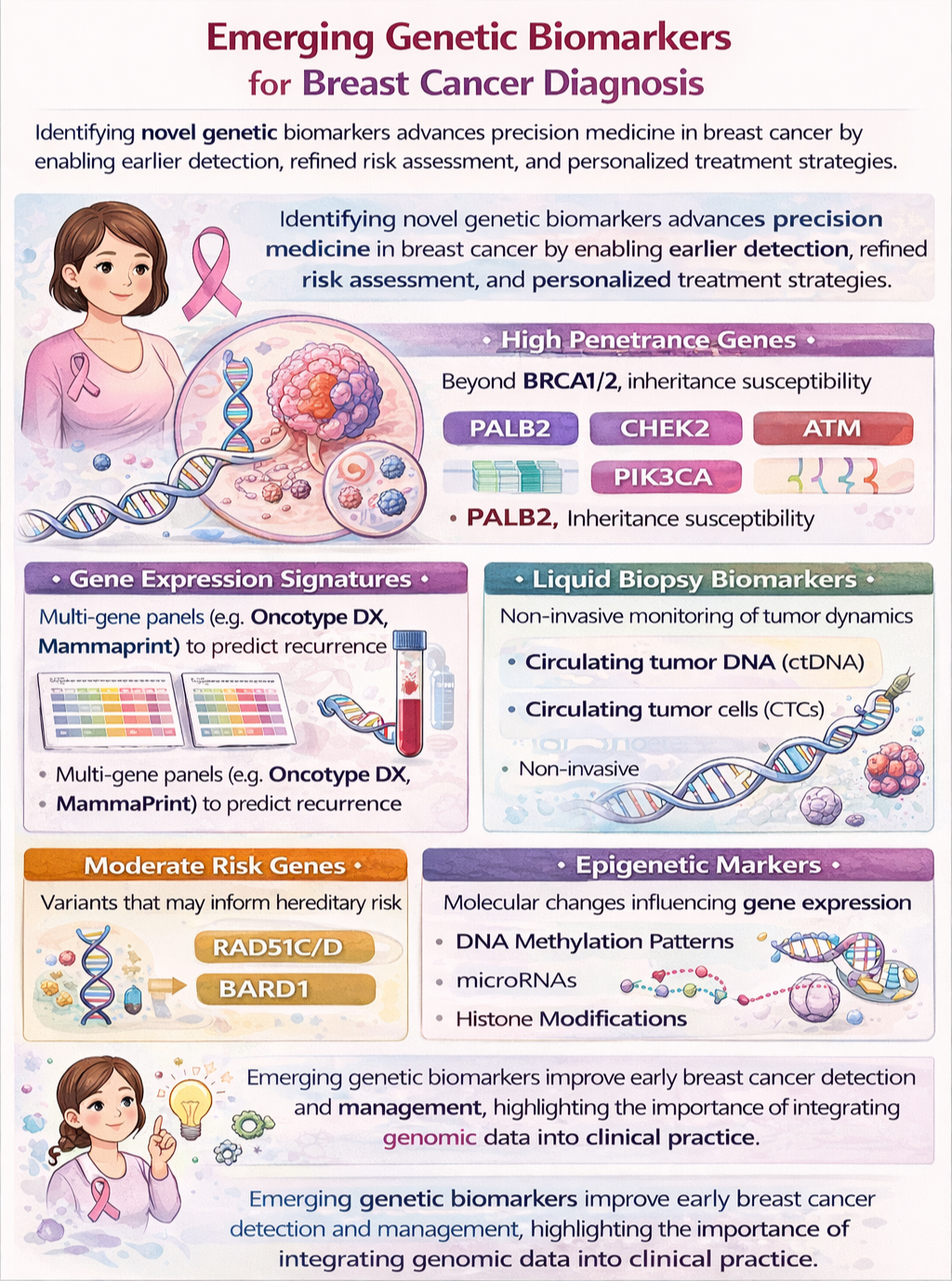 Breast cancer is a complex and heterogeneous disease, and early detection is crucial for improving patient outcomes. Recent advances in genomic technology have facilitated the identification of emerging genetic biomarkers that extend beyond traditional markers such as BRCA1 and BRCA2. BRCA1 and BRCA2 have limitations in identifying high risk individuals and predicting treatment responses. This review synthesizes current research on novel candidate change and genetic alternation that demonstrate potential clinical relevance in brief cancer diagnosis and management. This shift is unable more accurate early detection,refined risk satisfaction and the development of high personalized treatment strategies. Emerging research synthesizes a wide array of new candidate genes and molecular signatures with significant potential for clinical integration. Liquid biopsy biomarkers:Circulating tumor DNA (ctDNA), circulating tumor cells (CTCs), offer non- invasive real time monitoring of tumor dynamics. High penetrance genes:Beyond BRCA1/2, genes like PALB2, CHEK2,ATM and PIK3CA, which contribute to inherited suspectibility and Hereditary breast cancer risk.Moderate risk genes:Variants in genes like RAD51C/D and BARD1 my inform risk satisfaction.Gene expressions signatures:Multi gene panels (e.g., oncotype DX, Mamma Print) predict recurrence risk and guide treatment decisions. Epigenetic markers:DNA methylation patterns, microRNAs and histone modifications are emerging as potential diagnostics. Emerging genetics hold significant potential for refining this cancel diagnosis and management and emphasize the importance of integrating genomic data into clinical practice to advance precision medicine increase cancer care.