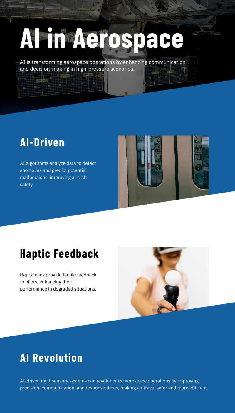 In aerospace operations, real-time decision-making is essential to ensure safety and efficiency, as even minor delays or misinterpretations can lead to significant risks. This project explores the potential of AI-driven technologies to enhance communication and decision-making in high-pressure scenarios. Current systems rely heavily on visual and auditory feedback, which can overwhelm operators and reduce situational awareness. To address these issues, this study investigates the integration of AI-based solutions, including haptic feedback systems and augmented reality (AR) for enhanced visualization. By leveraging AI algorithms for anomaly detection and predictive analysis, the system can identify potential malfunctions before they occur, improving overall safety. Haptic cueing algorithms provide tactile feedback, enhancing pilot performance in degraded situations. Results from studies by Rolls-Royce and the University of Maryland demonstrate the effectiveness of these technologies, highlighting improved reliability, performance, and decision-making capabilities. However, challenges such as the complexity of data processing, potential sensory conflicts, and increased cognitive load must be addressed. In conclusion, the adoption of AI-driven multisensory systems holds the potential to revolutionize aerospace operations by improving precision, communication, and response times, ultimately making air travel safer and more efficient.