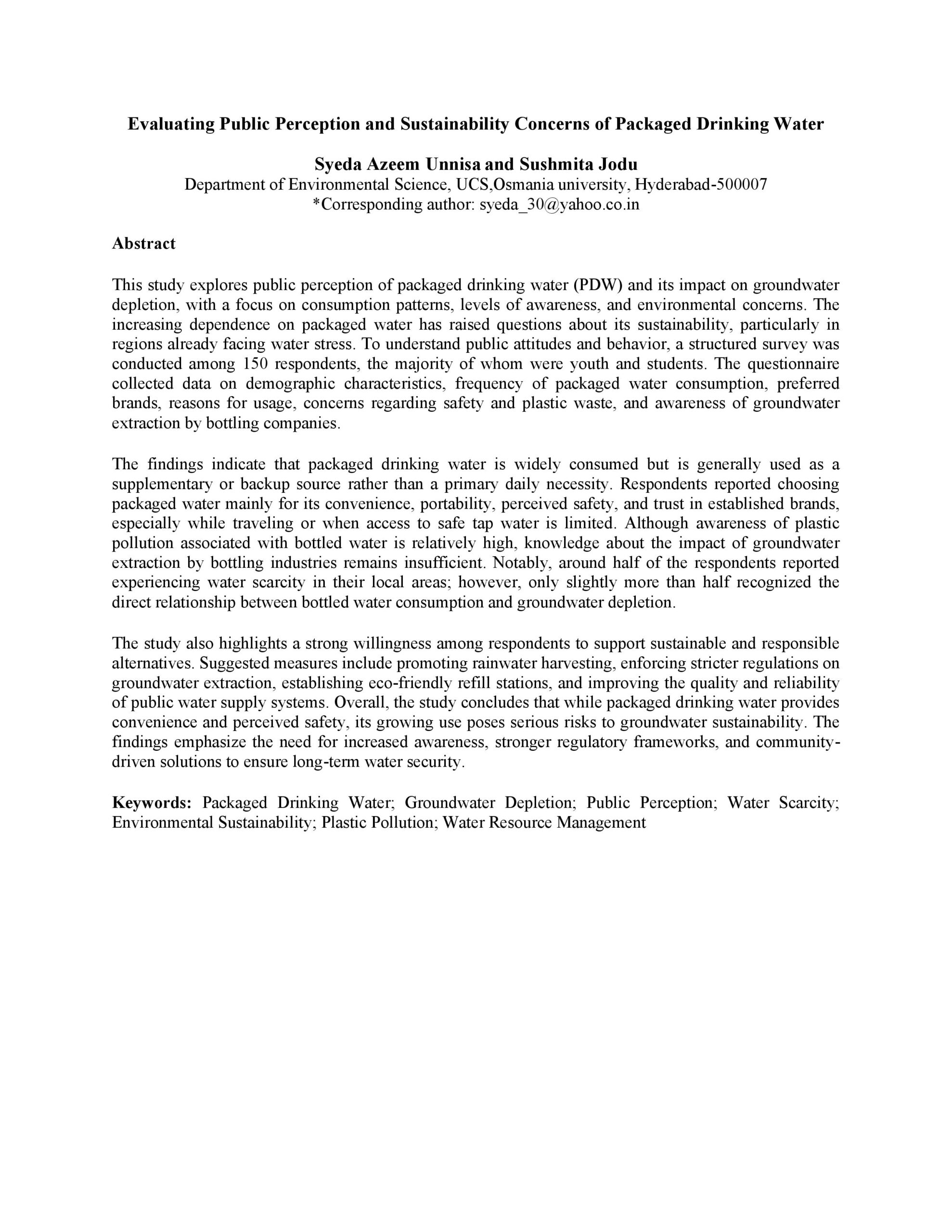 The study also highlights a strong willingness among respondents to support sustainable and responsible alternatives. Suggested measures include promoting rainwater harvesting, enforcing stricter regulations on groundwater extraction, establishing eco-friendly refill stations, and improving the quality and reliability of public water supply systems. Overall, the study concludes that while packaged drinking water provides convenience and perceived safety, its growing use poses serious risks to groundwater sustainability. The findings emphasize the need for increased awareness, stronger regulatory frameworks, and community-driven solutions to ensure long-term water security.