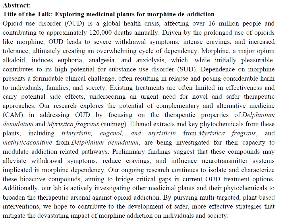 Opioid use disorder (OUD) is a global health crisis, affecting over 16 million people and contributing to approximately 120,000 deaths annually. Driven by the prolonged use of opioids like morphine, OUD leads to severe withdrawal symptoms, intense cravings, and increased tolerance, ultimately creating an overwhelming cycle of dependency. Morphine, a major opium alkaloid, induces euphoria, analgesia, and anxiolysis, which, while initially pleasurable, contributes to its high potential for substance use disorder (SUD). Dependence on morphine presents a formidable clinical challenge, often resulting in relapse and posing considerable harm to individuals, families, and society. Existing treatments are often limited in effectiveness and carry potential side effects, underscoring an urgent need for novel and safer therapeutic approaches. Our research explores the potential of complementary and alternative medicine (CAM) in addressing OUD by focusing on the therapeutic properties of Delphinium denudatum and Myristica fragrans (nutmeg). Ethanol extracts and key phytochemicals from these plants, including trimyristin, eugenol, and myristicin from Myristica fragrans, and methyllcaconitine from Delphinium denudatum, are being investigated for their capacity to modulate addiction-related pathways. Preliminary findings suggest that these compounds may alleviate withdrawal symptoms, reduce cravings, and influence neurotransmitter systems implicated in morphine dependency. Our ongoing research continues to isolate and characterize these bioactive compounds, aiming to bridge critical gaps in current OUD treatment options. Additionally, our lab is actively investigating other medicinal plants and their phytochemicals to broaden the therapeutic arsenal against opioid addiction. By pursuing multi-targeted, plant-based interventions, we hope to contribute to the development of safer, more effective strategies that mitigate the devastating impact of morphine addiction on individuals and society.