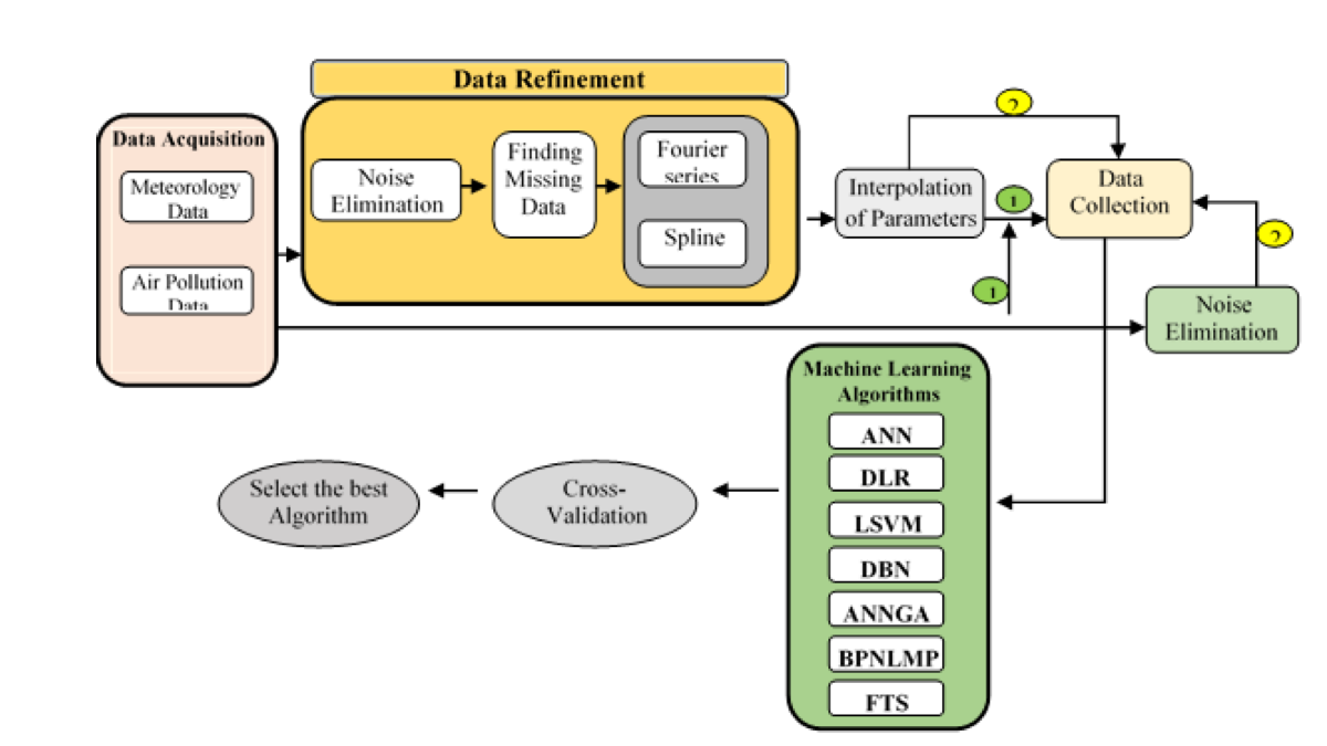 The growing concern for air pollution has been raised by many governments and people worldwide because it affects human health and sustainable development. Particularly, in India, the drastically deteriorating air quality threatens the health of its people. Meanwhile, in smart cities, knowledge of timely and reliable levels of air pollution is essential for the effective set-up of smart pollution systems. The current methods of air quality prediction primarily use shallow models which yield unsatisfactory results. Hence, it has inspired us to research methods of air quality prediction based on models of Neural Network (NN) architecture. In the present study, the NN architecture model was tested on air pollution data to improve the accuracy of prediction models. The two approaches proposed in this work are based on the Artificial Neural Network (ANN). The first method uses the Artificial Neural Network-Linear Vector Quantization (ANN-LVQ). It is an integration of the NN with LVQ, a significant Air Prediction Technique. The second method is a fusion of MultiLayer Perceptron Neural Network with Self Organization Map (MLPNN-SOM) technique. The main aims of implementing these methods are to provide early warnings by predicting air quality and estimate the influencing pollutant that contaminates the quality of air which thereby leads to air pollution. Upon analyzing literature review, feature extraction methods such as Feature Importance (FI), Principal Component Analysis (PCA), REFLIF-F and Self Organization Map (SOM) were considered based on the complexity of the problem. Feature selection is a process where the features in data are automatically selected to contribute to the prediction variable. After comparing the above-listed feature selection methods, the SOM method performed well in terms of accuracy and processing time. SOM visualization values were used as a similarity measure between the parameter that is to be forecasted and the parameters for the feature space. This method leads to the smallest set of parameters which surpass a similarity threshold. Next, to obtain the influencing pollutant that increases the AQI value, the second proposed fusion method (MLPNN-SOM) was employed to estimate the influencing pollutant which involves two phases. The first phase deals with the feature extraction technique. During the first phase, SOM was selected after comparing all other feature selection methods due to its accuracy and processing time. Based on the results, the proposed MLPNN-SOM method performed better than the other standard clustering. Network components such as activation function, learning rate, momentum, nodes and network structure strongly influence the classification performance of NN. Having said that, proper selection of weights and biases reduces the classification error. Therefore, in this study, the NN architecture was fine-tuned to enhance the classification performance by optimizing weights and biases deliberately.