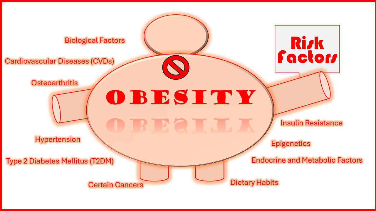 The prevalence of obesity has surged globally, becoming a significant public health challenge. According to recent findings from Global Burden of Disease (GBD) studies and World Health Organization (WHO) reports, obesity rates have nearly tripled since 1975. The latest global obesity statistics shows that in 2023, over 1 billion people worldwide were classified as obese, including: 650 million adults (≥18 years old); 340 million adolescents (5–19 years old) and 39 million children (<5 years old). The prevalence in countries like the United States and Saudi Arabia exceeds 40%.. Rapid urbanization and dietary shifts have escalated obesity rates in nations like India, China, and Brazil. Obesity is emerging as a problem in urban areas due to increased access to processed foods and sedentary lifestyles. Obesity is a complex condition influenced by a combination of genetic, behavioral, environmental, and physiological factors. Understanding these risk factors is crucial for developing effective prevention and management strategies. Below are the primary risk factors for obesity: (i) Type 2 Diabetes Mellitus (T2DM), (ii) Cardiovascular Diseases (CVDs), (iii) Hypertension, (iv) Osteoarthritis, (v) Certain cancers (e.g., breast, colon) (vi) Dietary Habits: (most important parameter), (vii) Endocrine and Metabolic Factors (Hormonal Imbalances: conditions like hypothyroidism, Cushing’s syndrome, and polycystic ovarian syndrome (PCOS) can slow metabolism and promote fat accumulation), (viii) Insulin Resistance (Hyperinsulinemia can lead to increased fat storage and weight gain, creating a vicious cycle of obesity and metabolic dysfunction), (ix) Biological Factors (Gut Microbiota: an imbalance in gut bacteria (dysbiosis) can influence energy metabolism and fat storage, increasing obesity risk), (x) Epigenetics (Environmental exposures during critical developmental periods can alter gene expression and predispose individuals to obesity). Obesity arises from an interplay of genetic susceptibility, unhealthy behaviors, and environmental factors. Targeting these risk factors through lifestyle modifications, policy changes, and individualized healthcare interventions is essential for prevention and management.