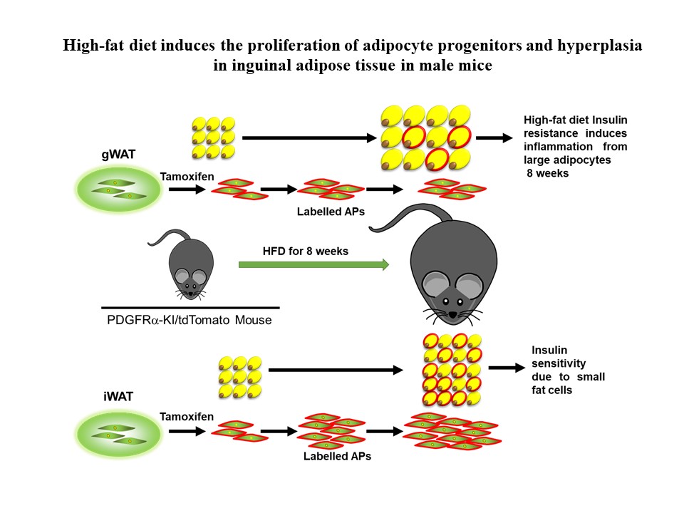 Expansion of white adipose tissue (WAT) via recruitment of adipocytes (hyperplasia) is metabolically healthy, whereas that through the enlargement of pre-existing adipocytes (hypertrophy) leads to metabolic complications. Previous reports suggest that in animals receiving a high-fat diet (HFD), only adipocyte progenitors (APs) in gonadal WAT (gWAT) have proliferative potential. However, the proliferative and adipogenic capacity of APs in the inguinal WAT (iWAT) of male mice remains contradictory. Our objective is to elaborate on the proliferative and adipogenic potential of APs in iWAT of HFD-fed male mice. We generated PDGFRα-GFP-CreERT2/tdTomato (KI/td) mice and performed comprehensive analysis, including immunohistochemistry, flow cytometry, and gene expression analysis. Contrary to the findings of others, we found increased numbers of newly-generated tdTomato+ adipocytes in iWAT than that in gWAT of male mice. We found that in male mice, iWAT has more proliferating tdTomato+ APs with higher expression of Dpp4 and Pi16 than gWAT of mice fed HFD for 8 weeks. Collectively, in male mice, compared with gWAT, iWAT undergoes hyperplasia in response to 8 weeks of HFD feeding through the recruitment of newly generated adipocytes.