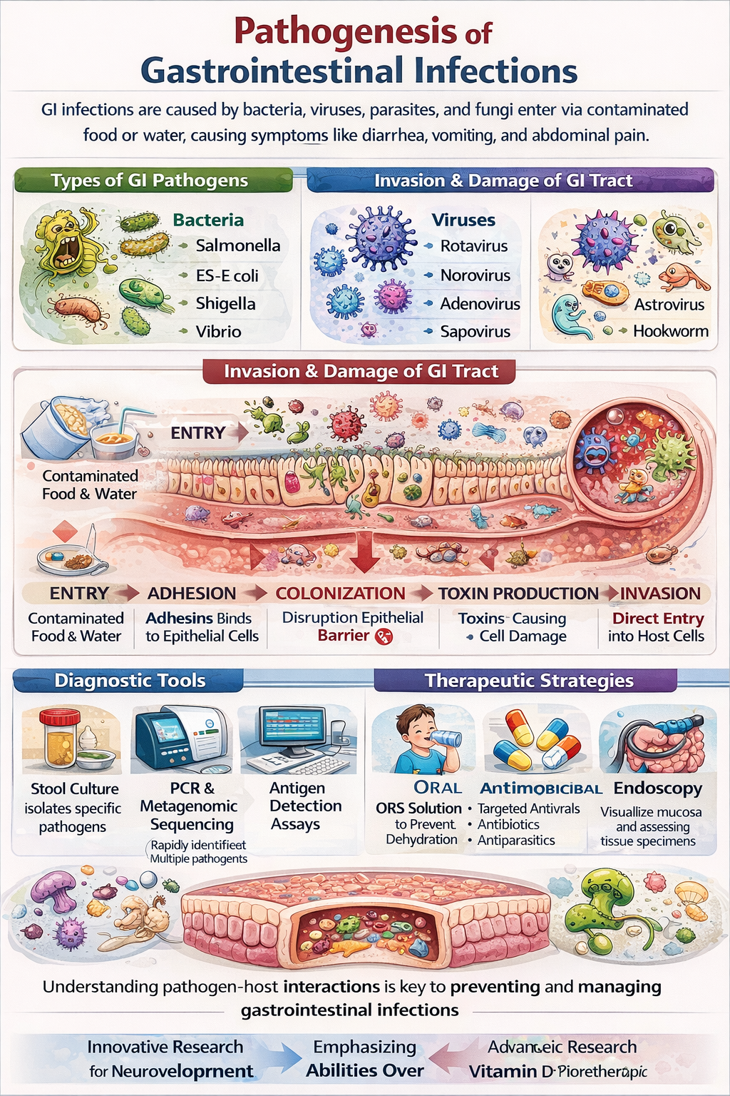 Gastrointestinal (GI) infections are caused by a diverse array of pathogens—including bacteria, viruses, parasites, and fungi—that primarily enter the host via ingestion of contaminated food or water. Upon surviving gastric acidity, these pathogens interact with the intestinal epithelium through virulence mechanisms such as adhesion, colonization, toxin production, invasion, and inflammation. Bacterial agents like Salmonella spp. trigger robust inflammatory responses leading to mucosal damage, while toxins from Vibrio cholerae and Shigella spp. disrupt epithelial integrity, resulting in secretory diarrhea and enteric inflammation. Viral GI pathogens—including Rotavirus, Norovirus, Adenovirus, Astrovirus, and Sapovirus—target enterocytes, impairing absorption and secretion, and manifesting as diarrhea, vomiting, and abdominal pain. Recent advances in molecular diagnostics, such as multiplex PCR panels and metagenomic sequencing, have enhanced pathogen detection and epidemiological surveillance. Parasitic infections, prevalent in tropical and resource-limited settings, are transmitted via fecal-oral routes. Entamoeba histolytica, the causative agent of amoebiasis, invades colonic mucosa, leading to ulceration and systemic dissemination. Improved diagnostic tools—including antigen detection assays and real-time PCR—have refined clinical management. Fungal GI infections, though less common, pose significant risks to immunocompromised individuals. Pathogenesis involves mucosal invasion facilitated by dysbiosis and immune suppression, with symptoms including odynophagia, abdominal pain, and diarrhea. Diagnosis relies on endoscopy, histopathology, culture, and increasingly on molecular and AI-assisted platforms. Therapeutic strategies include oral rehydration therapy, targeted antimicrobials, vaccines, probiotics, and emerging microbiome-based interventions. Understanding the dynamic interplay between pathogen virulence, host immune responses, and gut microbiota is essential for developing precision-based strategies to prevent and manage GI infections.