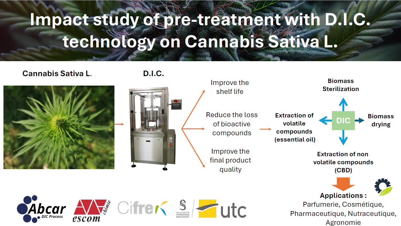 Instant Controlled Pressure Drop (DIC) is an emerging agri-food technology that applies high-temperature, short-time treatments, altering material structures by expansion while preserving product quality. DIC shows promise for applications such as biomolecule drying, sterilization, and extraction, reducing energy costs and better preserving product quality compared to conventional processes. This research aims to determine the impact of DIC pretreatment on the extraction of essential oils and cannabidiol (CBD) from Cannabis Sativa L. buds. Objectives include decarboxylating the plant, improving extraction efficiency, preserving compounds, increasing storage stability, and exploring product and byproduct applications. This work investigates how to enhance process efficiency from harvest to product formulation by integrating DIC technology for hemp pretreatment, addressing scientific challenges, and offering higher-quality hemp products.