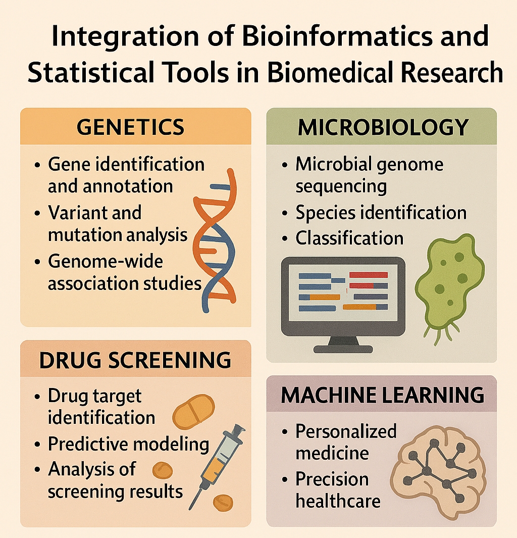 The continuous and rapid growth of high-throughput biological data has made the integration of bioinformatics and statistical tools essential in biomedical research. It is deemed essential because of its applicability across several domains like genetics, microbiology, and drug screening for computational and statistical methodologies for data analysis, sequence alignment, and predictive modeling. Bioinformatics tools such as sequence alignment algorithms, genomic databases, and molecular modeling platforms make handling efficient and interpretation of large-scale biological datasets is sped up while maintaining accuracy during handling. Data validation, hypothesis testing, pattern recognition, and model evaluation is executed flawlessly. In genetics it is often utilized in gene identification and annotation, variant and mutation analysis, Genome-wide association studies (GWAS), and similarly in microbiology it is used in microbial genome sequencing, species identification and classification. In drug screening bioinformatics handles and interprets the biological data and statistical tools to analyze the large data and find meaningful patterns so the researchers can identify the potential drug targets, predict how the drug might interact with proteins and analyze the screening results. With determination researchers are quickly adapting to advanced machine learning and AI integration for personalized medicine and precision healthcare while setting up the foundation for real-time genomic and clinical data analysis and automated drug discovery pipelines. In conclusion, integration of bioinformatics and statistical tools is indispensable in modern biomedical research which enables comprehensive analysis across genetics, microbiology, and drug discovery, driving innovation in diagnostics, therapeutics, and personalized medicine.