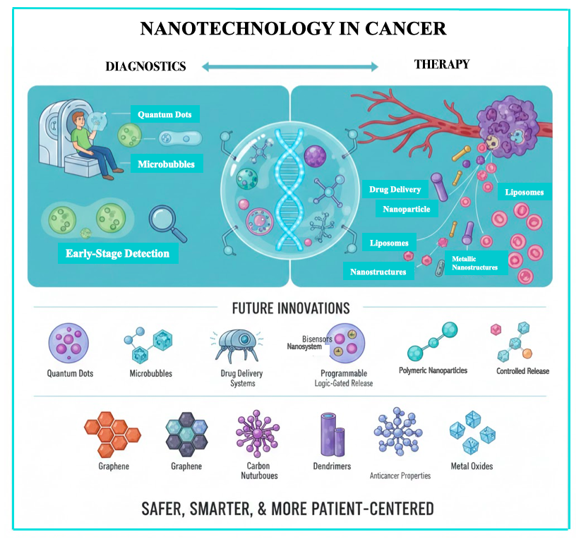 Nanotechnology has rapidly evolved into a transformative frontier in cancer diagnosis and therapy, reshaping how clinicians and researchers approach the disease. Unlike conventional treatments, which often lack specificity and cause significant collateral damage, nanomaterials offer precision, efficiency, and reduced toxicity. Current applications include nanoparticle-based drug delivery systems that encapsulate chemotherapeutic agents, ensuring controlled release at tumor sites while sparing healthy tissues. Liposomes, polymeric nanoparticles, and metallic nanostructures are notable examples that improve bioavailability, extend circulation time, and enhance therapeutic outcomes. In diagnostics, nanomaterials such as microbubbles and quantum dots are being utilized as advanced imaging agents, enabling faster, more sensitive, and non-invasive detection of malignancies. Looking ahead, the field envisions the integration of smart nanorobots and programmable nanosystems capable of autonomously identifying and eradicating malignant cells. These innovations may employ tumor-specific molecular cues, biosensors, and logic-gated release mechanisms to achieve unprecedented precision. Furthermore, diverse nanoparticle platforms—including graphene, carbon nanotubes, dendrimers, and metal oxides—are being explored not only for drug delivery but also for their intrinsic anticancer properties, such as antioxidant activity and direct tumor inhibition. By bridging materials science, oncology, and bioengineering, nanotechnology is poised to revolutionize cancer care, advancing both diagnostic accuracy and therapeutic personalization, and ultimately contributing to a future where treatment is safer, smarter, and more patient-centered.