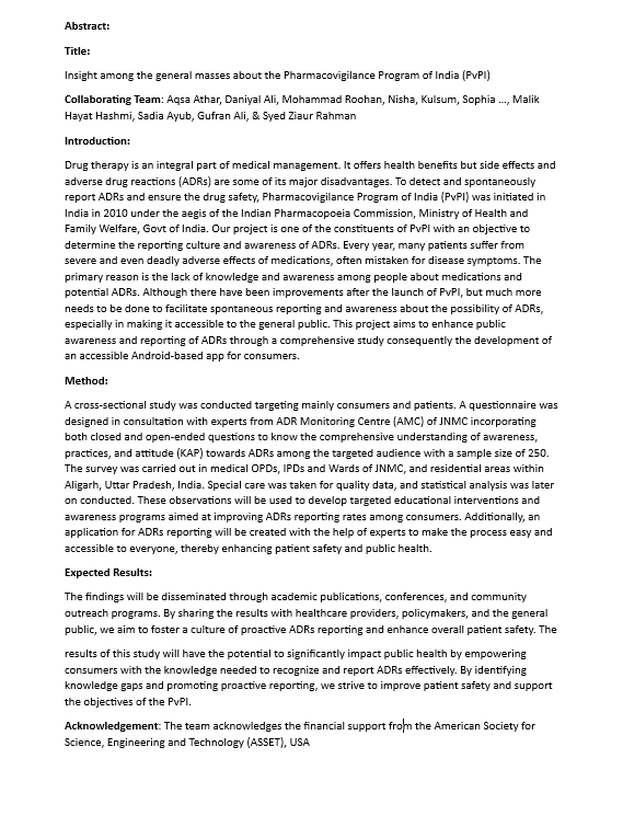 Acknowledgement: The team acknowledges the financial support from the American Society for Science, Engineering and Technology (ASSET), USA