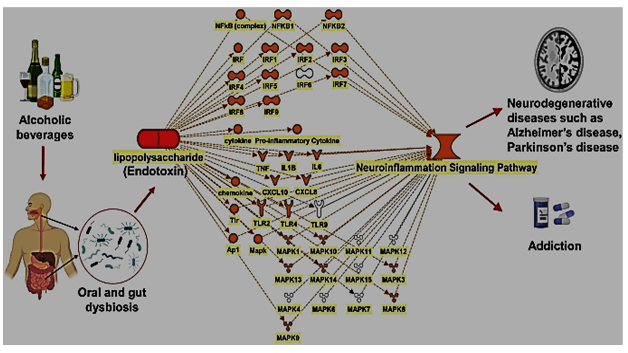 Drawing on data from the QIAGEN Knowledge Base (QKB) and GEO public datasets using a machine learning algorithm (Ingenuity Pathway Analysis [IPA]), a network meta-analysis on the molecular mechanisms underlying alcohol misuse elevation of amyloid precursor protein (APP) expression. The primary investigation focused on the involvement of neuroinflammatory signaling pathways in alcohol modulation of APP as a potential risk factor in AD. Pathways and connectivity maps were generated using QKB and IPA and were used to analyze GEO public datasets collected from in-vivo and in-vitro studies, representing exposure to alcohol in the prenatal, adolescent and adult. Analysis of connectivity maps revealed 40 molecules that are influenced by alcohol misuse and influence APP. Among these molecules, 24 molecules that are associated with acetaldehyde, a metabolite of alcohol with toxic effects, and APP. In this study, a computational algorithm was used to generate functional connectivity among the biological molecules, signaling pathways, and diseases and functions. This IPA bioinformatics study has revealed the involvement of systemic inflammation and the neuroinflammation signaling pathways in alcohol-induced modulation of APP and increased expression of APP is associated with AD.