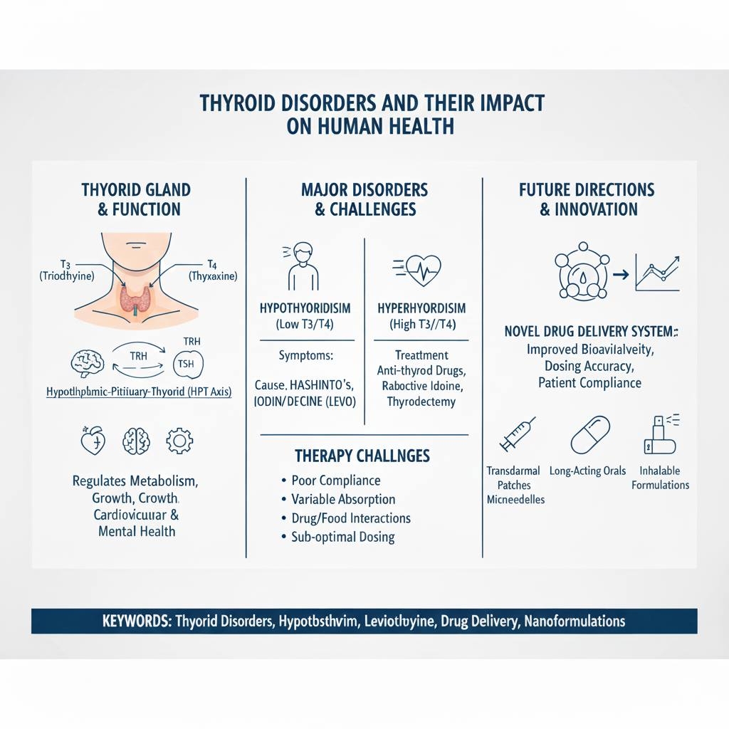 Thyroid hormones play a crucial role in regulating metabolic processes, growth, and development, and maintaining cardiovascular, physical, and mental health. Disruption of thyroid gland activity can lead to hypothyroidism or hyperthyroidism, both of which may result in serious illness if undiagnosed or inadequately treated. Hypothyroidism is most commonly managed through replacement therapy with levothyroxine (LEVO), a synthetic form of thyroxine, while hyperthyroidism is treated using anti-thyroid drugs, radioactive iodine, or thyroidectomy. These therapies are typically administered via oral, intravenous, or rectal routes. Despite long-standing clinical use, conventional treatment approaches are associated with several challenges, including poor patient compliance, variable gastrointestinal absorption, and significant interactions with food and other medications, often leading to sub-optimal dosing and adverse clinical outcomes. The thyroid gland, located in the anterior neck, synthesizes and secretes triiodothyronine (T3) and thyroxine (T4), with T3 being the biologically active form. Although both hormones are produced by the thyroid, approximately 80% of circulating T3 is generated through peripheral conversion of T4. Thyroid hormone secretion is tightly regulated by the hypothalamic–pituitary–thyroid axis via a negative feedback mechanism involving thyrotropin-releasing hormone and thyroid-stimulating hormone. Hypothyroidism is characterised by insufficient thyroid hormone production and affects approximately 5% of the global population, with a similar proportion remaining undiagnosed. Primary hypothyroidism accounts for the majority of cases and is commonly caused by iodine deficiency or autoimmune conditions such as Hashimoto’s thyroiditis. Given the limitations of current therapies, there remains a clear need for novel drug delivery approaches to improve bioavailability, dosing accuracy, and patient compliance. This review highlights conventional treatment strategies and explores emerging drug delivery systems aimed at improving therapeutic outcomes in thyroid disorders.